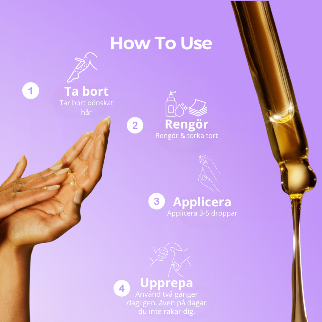 Det är faktiskt så enkelt! Tänk på det som en del av din dagliga hudvårdsrutin. Efter att du tagit bort hår (rakat, vaxat eller vad du föredrar), applicera 3–5 droppar av serumet på ren och torr hud och massera in det försiktigt tills det absorberats.