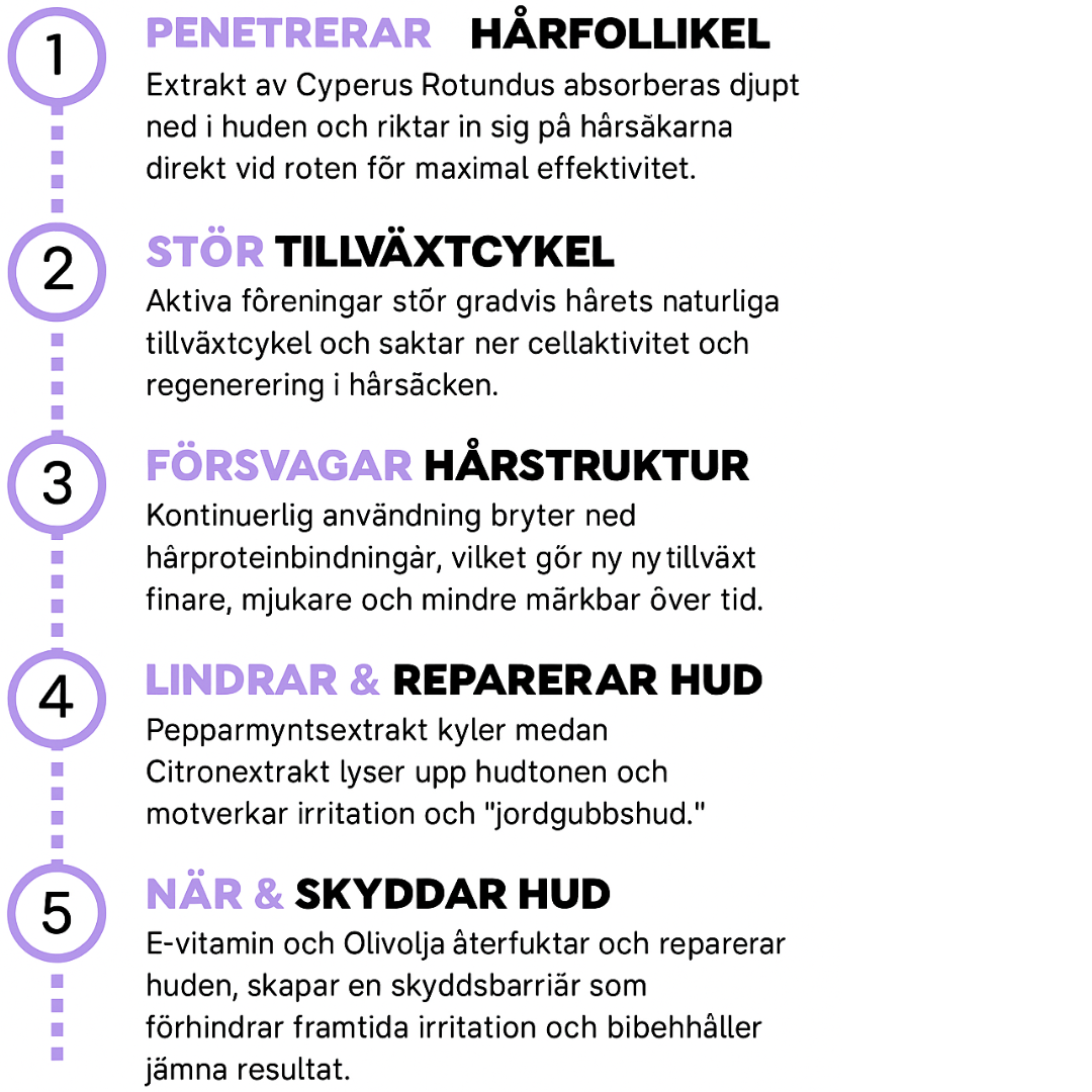 De flesta användare märker att håret växer tillbaka långsammare och tunnare inom 1–2 veckor vid regelbunden användning. Vid långvarig och konsekvent användning rapporterar många en tydlig minskning av hårväxten – som håller i sig även vid mer sällan applicering. Resultaten blir bättre ju längre du använder produkten regelbundet.